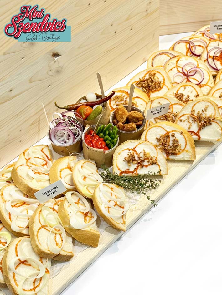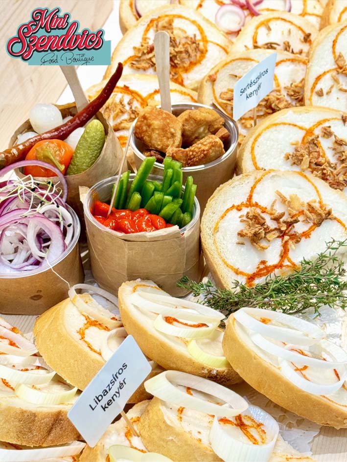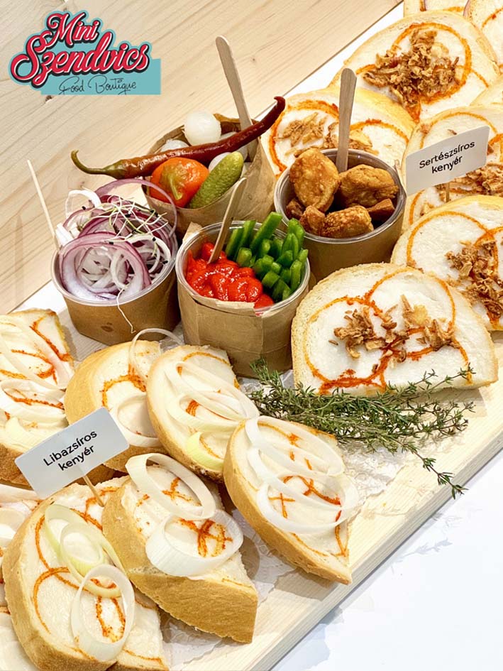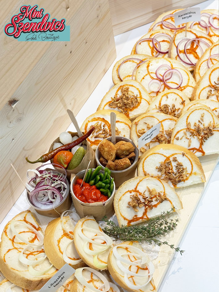 Friss kenyérszeletek házi zsírral (kacsa, liba, sertés) megkenve, paprikával megszórva, tálalva kiegészítőkkel, lilahagyma karikákkal, savanyúságokkal, csípős paprikával, paradicsommal, és ropogós tepertővel.