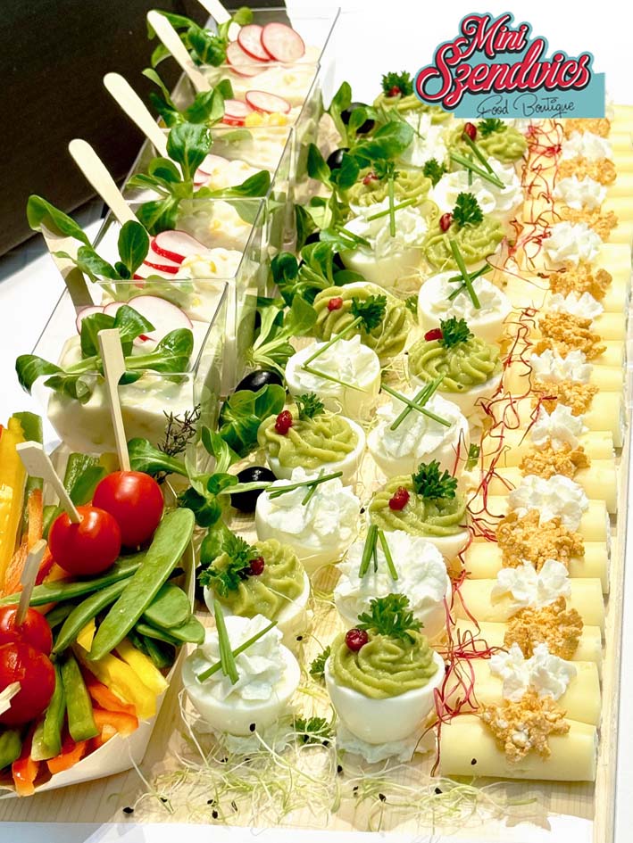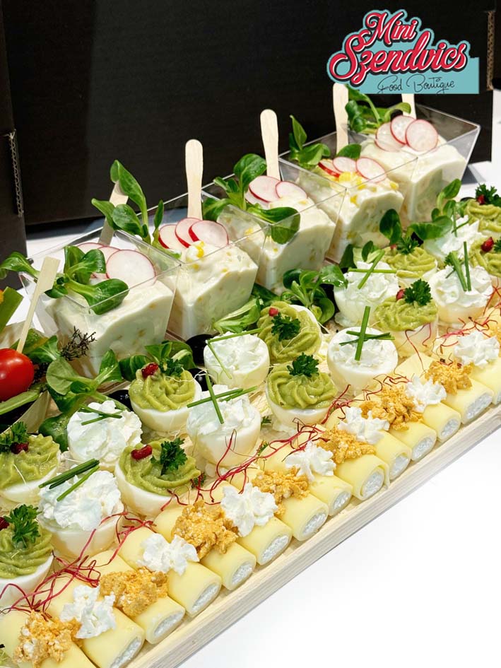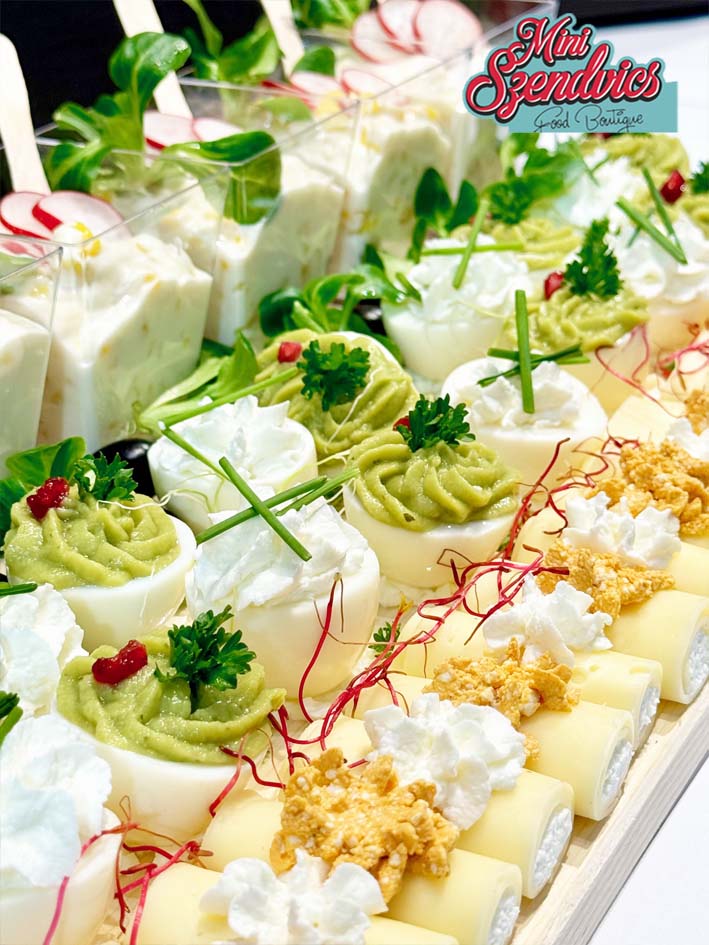 A tálon avokádókrémmel és jutúróval töltött tojások, körözöttel és márványsajttal töltött sajtekercs, valamint kukoricasaláta, franciasaláta és friss, színes zöldségek találhatók.